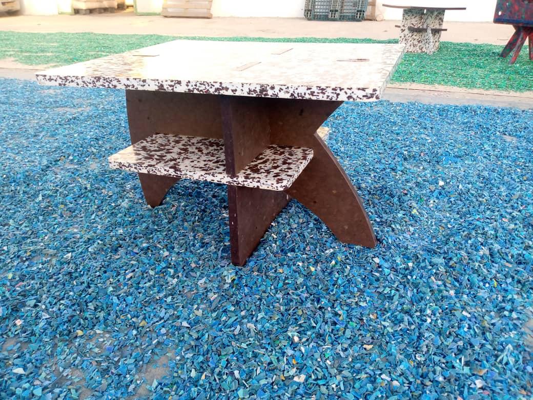 La Table Shella allie esthétique moderne et engagement écologique. Fabriquée à partir de plastique recyclé, elle est pensée pour durer tout en valorisant les déchets plastiques collectés localement.